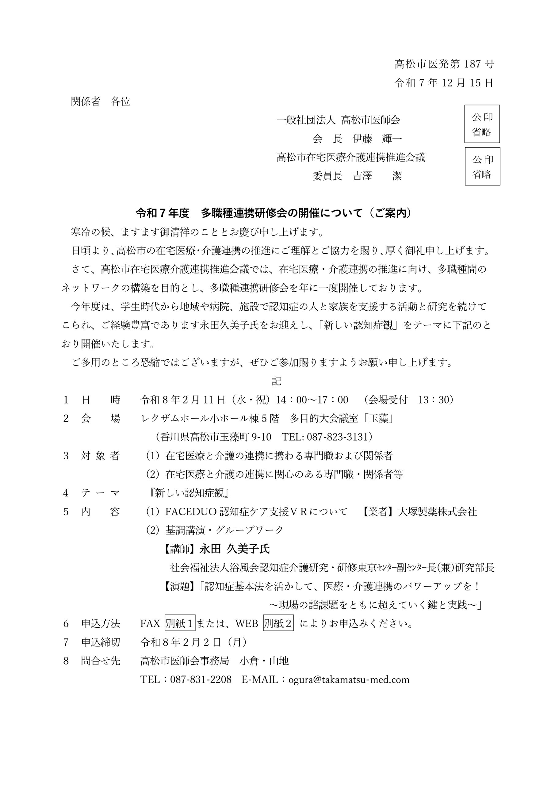 | 問合せ | 公益社団法人香川県看護協会 ☎087-864-9070 担当:三村・鳥山 |