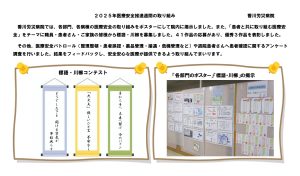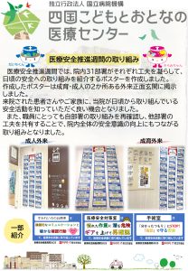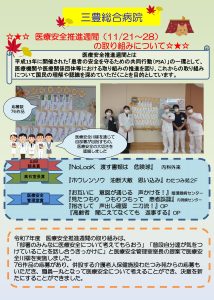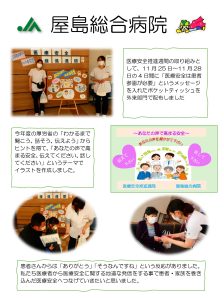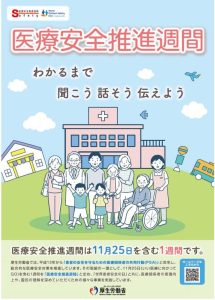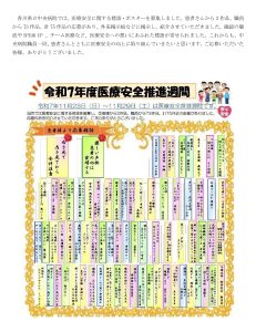 令和7年度 医療安全推進週間について 安全管理ネットワーク委員会 厚生労働省では平成13年から「患者の安全を守るための医療関係者の共同行動(PSA)」と命名し、医療安全対策を推進しています。その一環として11月25日(いい医療に向かってGO)を含む1週間を「医療安全推進週間」と定め、医療関係者の意識向上や、国民の理解を深めていただくための様々な事業を実施しています。今年度の厚生労働省によるテーマは「わかるまで 聞こう 話そう 伝えよう」です。医療者と患者さんの間のコミュニケーションの重要性が強調されたテーマです。患者安全には、医療従事者だけでなく、患者さん自身にも医療安全の当事者として積極的に関わることが大切だとされており、患者参画を促進しています。これを受け、各医療機関等において医療安全向上のための様々な取り組みがなされています。安全管理ネットワーク委員各施設での取り組みを紹介してきます。 |